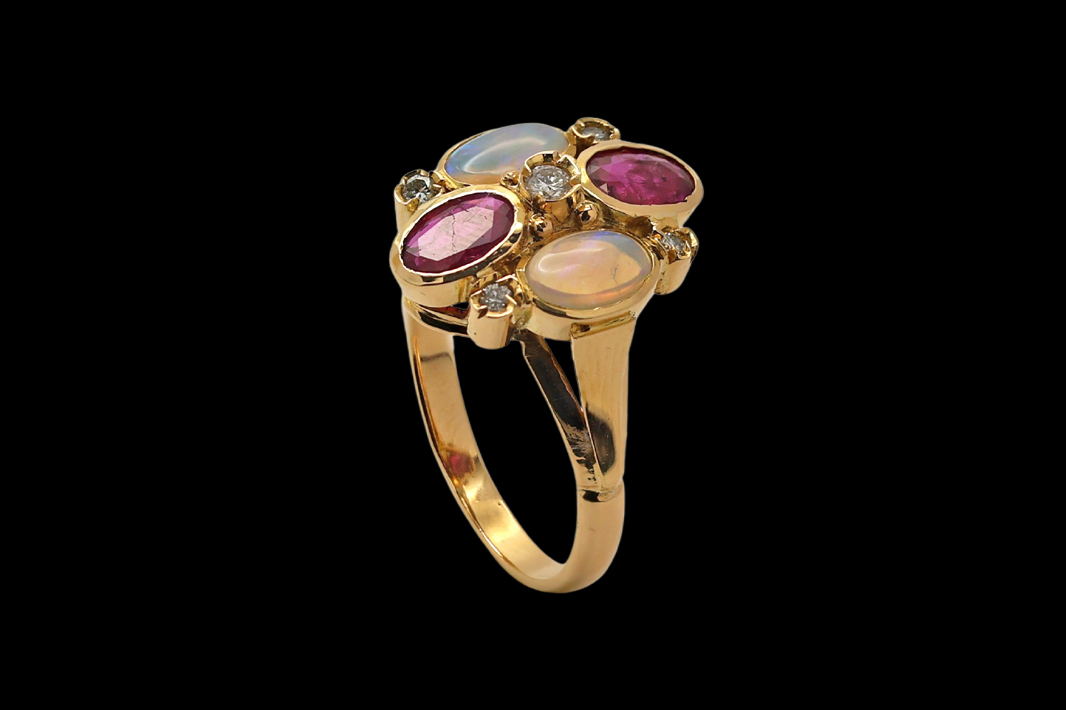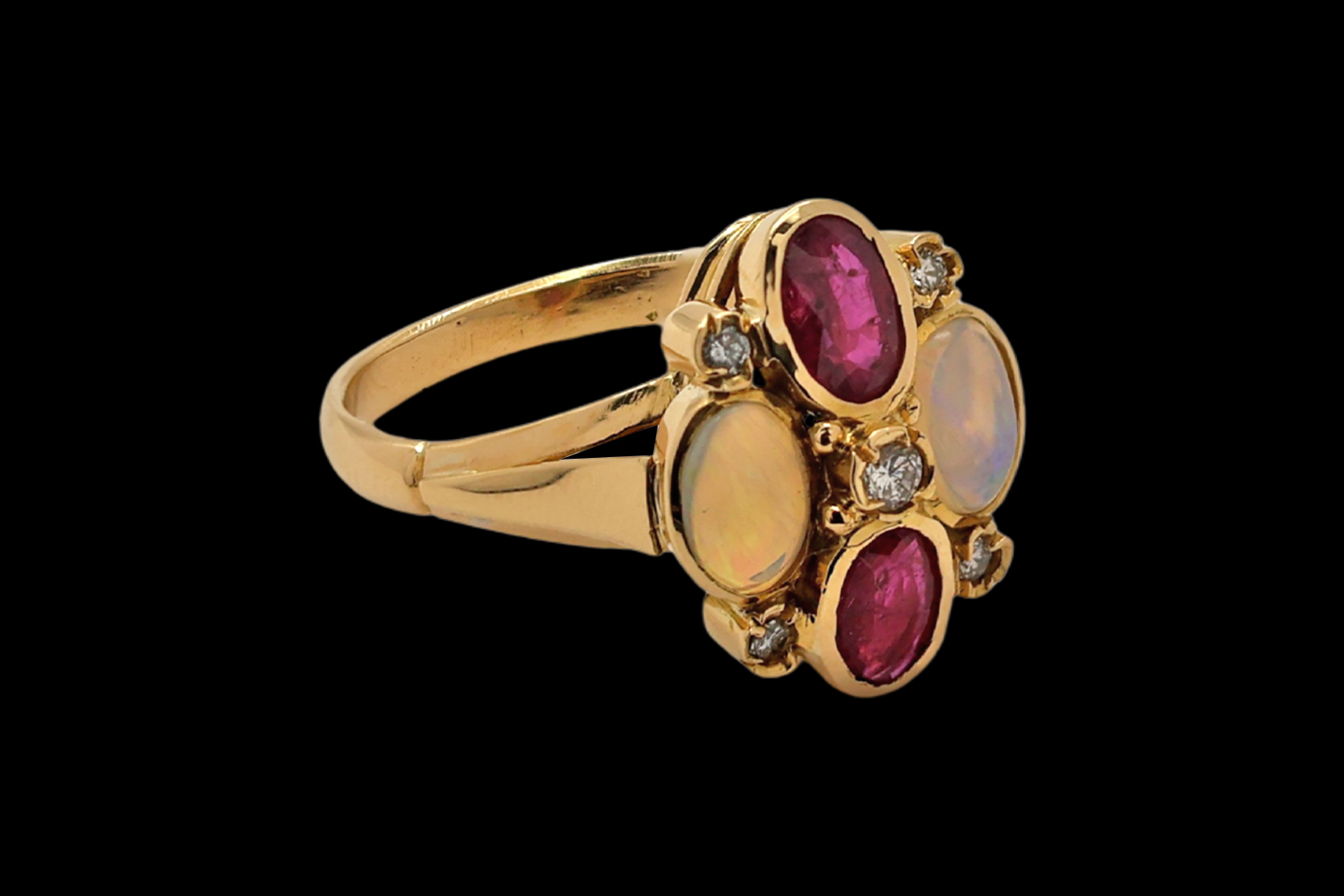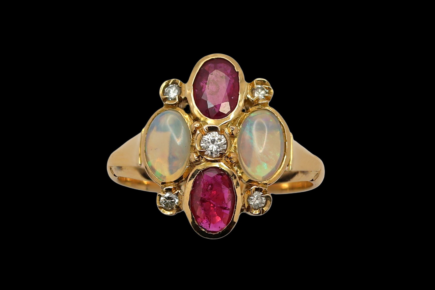 Tanto os Rubis como as Opalas têm lapidação Oval com aproximadamente 6 x 4 mm.